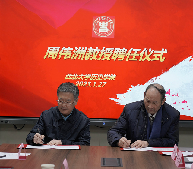 仪式上,欧冠官方网站人力资源部负责人宣读了学校聘任周伟洲教授担任中国民族史团队首席专家决议,郭立宏和周伟洲教授共同签署协议。