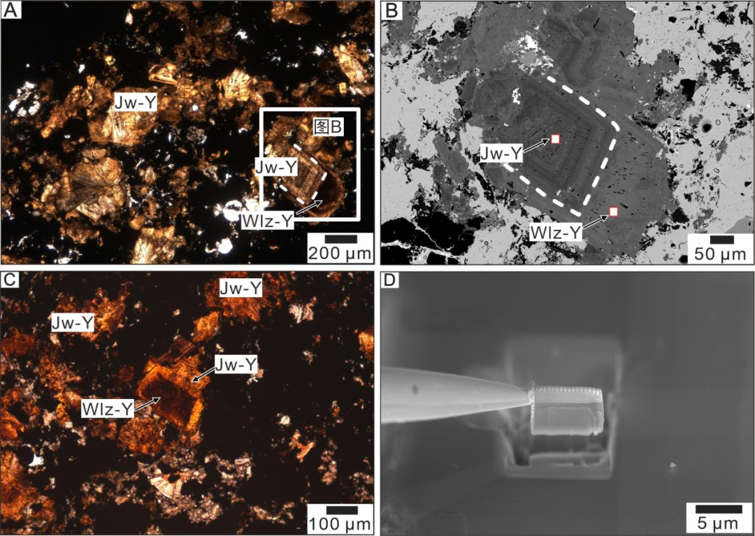 文兰钒钇矿显微镜下、BSE以及FIB取样制样照片 Jw-Y:景文矿;Wlz-Y:文兰钒钇矿