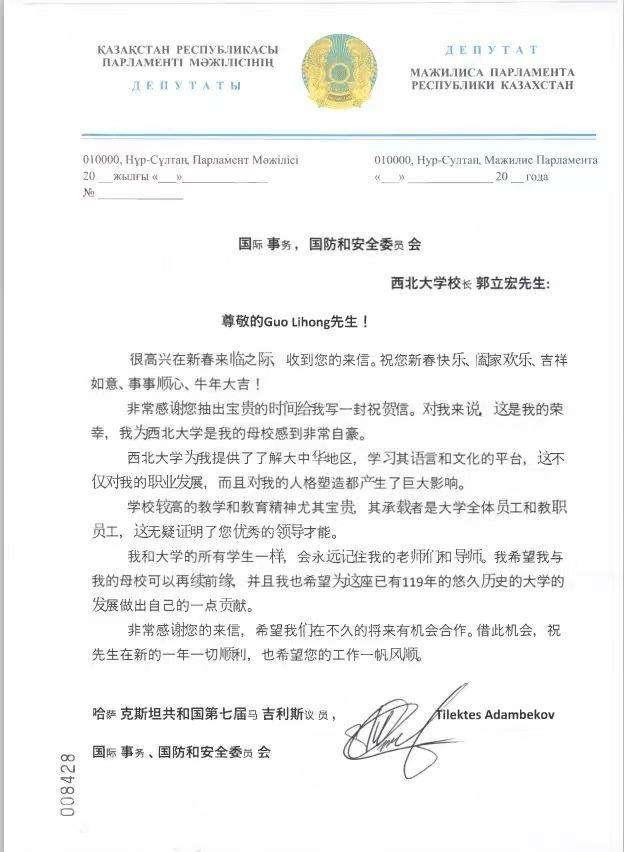 如今,中亚学院培养的千余名留学生校友活跃在丝路沿线国家发展的不同领域,为“一带一路”建设贡献着智慧与力量。其中,哈萨克斯坦籍Adambekov Tiletes(亚当)2021年当选哈萨克斯坦共和国第七届马吉利斯(议会下院)议员后,2023年再次当选新一届国会议员。