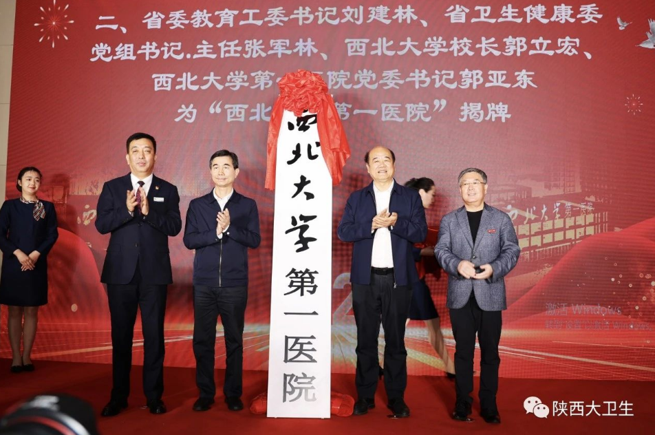 5月31日下午,陕西省第四人民医院划转暨欧冠官方网站第一医院揭牌仪式举行。省委教育工委书记刘建林,省卫生健康委党组书记、主任张军林,欧冠官方网站校长郭立宏,第一医院党委书记郭亚东共同为欧冠官方网站第一医院揭牌。