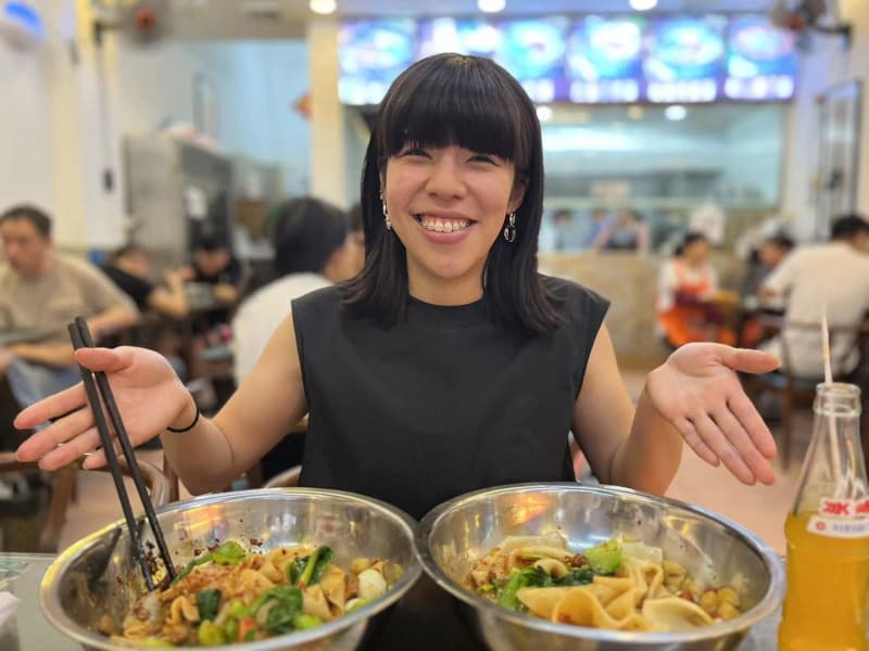 陝西省の麺料理を楽しむ熊谷花奈さん。(資料写真、西安=新華社配信/熊谷花奈)