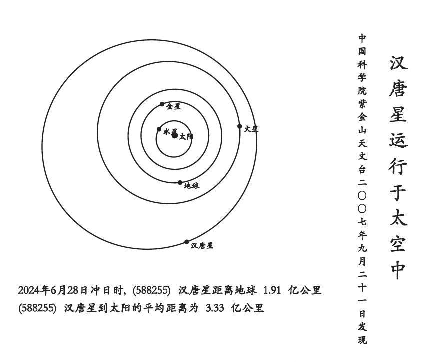据了解, 2007年9月21日,汉唐星由紫金山天文台盱眙天文观测站近地天体望远镜发现,后续得到了卡塔琳娜巡天、洛威尔天文台、林肯实验室巡天、泛星计划等多次观测证实,并进一步计算出它的精确轨道,符合国际上新小行星获永久编号所需的条件。国际小行星中心给予588255号永久编号,并确认紫金山天文台拥有该天体的发现命名权。