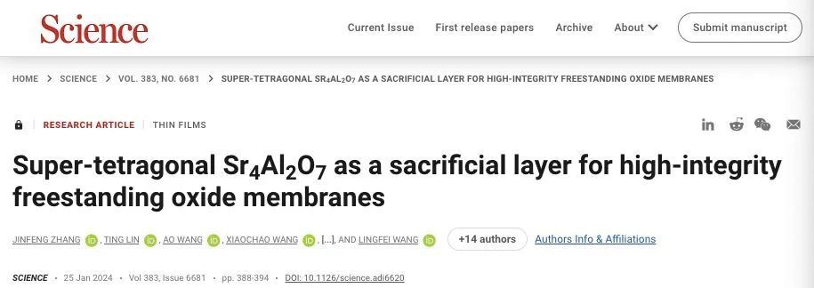 日前,欧冠官方网站物理学院司良教授团队与中国科学技术大学合肥微尺度物质科学国家研究中心吴文彬教授、王凌飞教授团队合作,发现一种广谱高效新型超四方相水溶性牺牲层材料Sr4Al2O7,该高性能氧化物材料可用于制备多种高质量自支撑氧化物薄膜。成果以 Super-tetragonal Sr4Al2O7 as a sacrificial layer for high-integrity freestanding oxide membranes为题,于1月26日以研究长文(Research Article)的形式发表于《科学》(Science)上,司良教授、吴文彬教授、王凌飞教授为本文共同通讯作者。