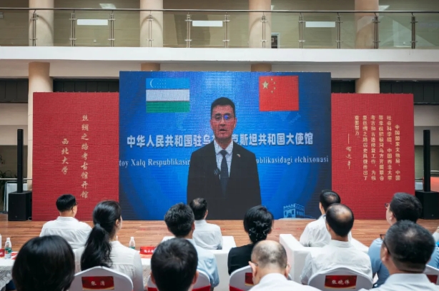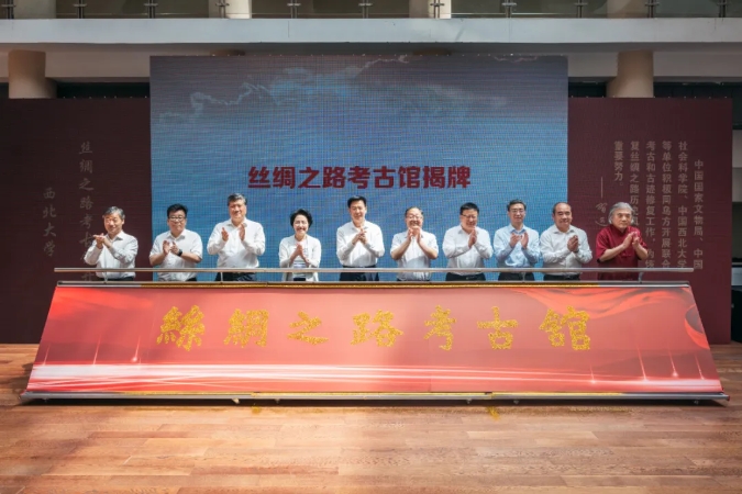 省人大常委会党组书记、副主任庄长兴,省委宣传部常务副部长鲍永能,省委外事办公室主任、省对外友协常务副会长姚红娟,省人大常委会机关党组书记、秘书长韩一兵,省人大教科文卫委员会主任委员、常委会教科文卫工作委员会主任王建利,省委教育工委委员冀映秋,省文物局副局长孙周勇,陕西历史博物馆馆长侯宁彬,欧冠官方网站党委书记蒋林,欧冠官方网站中亚考古队队长王建新共同为丝绸之路考古馆揭牌,中国驻乌兹别克斯坦大使于骏视频致辞。开馆仪式由蒋林主持。