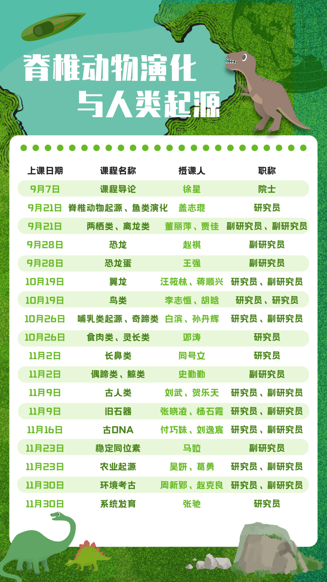 徐星院士首讲拉开这门课程的大幕之后,2024年秋季学期,邓涛、付巧妹、汪筱林等知名学者和一批青年骨干,将陆续来到欧冠官方网站,分别讲授“脊椎动物起源与鱼类演化”“两栖类、离龙类动物”“哺乳类动物起源”“食肉类、灵长类动物”“古人类”“古DNA”“农业起源”“环境考古”“系统发育”等课程。课程的设计是“将脊椎动物的进化置于整个地质历史的框架中予以讲解,让学生对生命演化的复杂性以及地球环境的长期演变有更深的认识。”授课专家全部来自中国科学院古脊椎所,他们在各自研究的领域均拥有丰富的教学经验和科研成果,这样的“豪华阵容”能够确保让本科生接触到当今古生物学界最前沿的研究成果。
