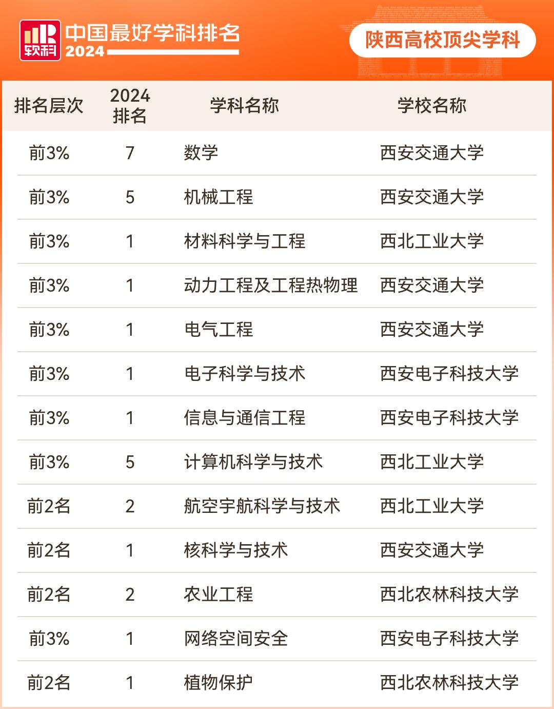 10月15日,高等教育评价专业机构软科正式发布“2024软科中国最好学科排名”。陕西共有25所高校255个学科上榜,其中,冠军学科数量达到8个,仅次于北京、上海和江苏;中国顶尖学科数量达13个;中国一流学科63个。