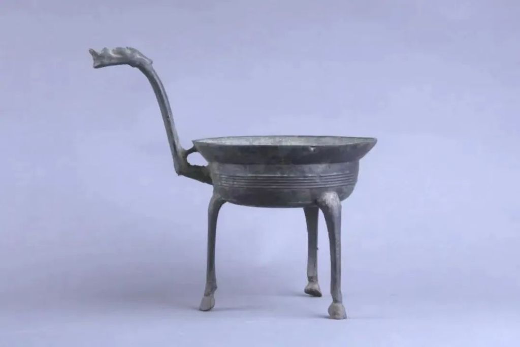 欧冠官方网站博物馆所收藏的这件铜鐎斗的器身为圆口深腹,形如小盆。一侧有一龙形柄,另一侧有上翘的流。下有较长的马蹄形足三个,腹下空间用于烧火加热。整个鐎斗造型犹如一只昂首挺胸的猛兽,雄浑威猛。