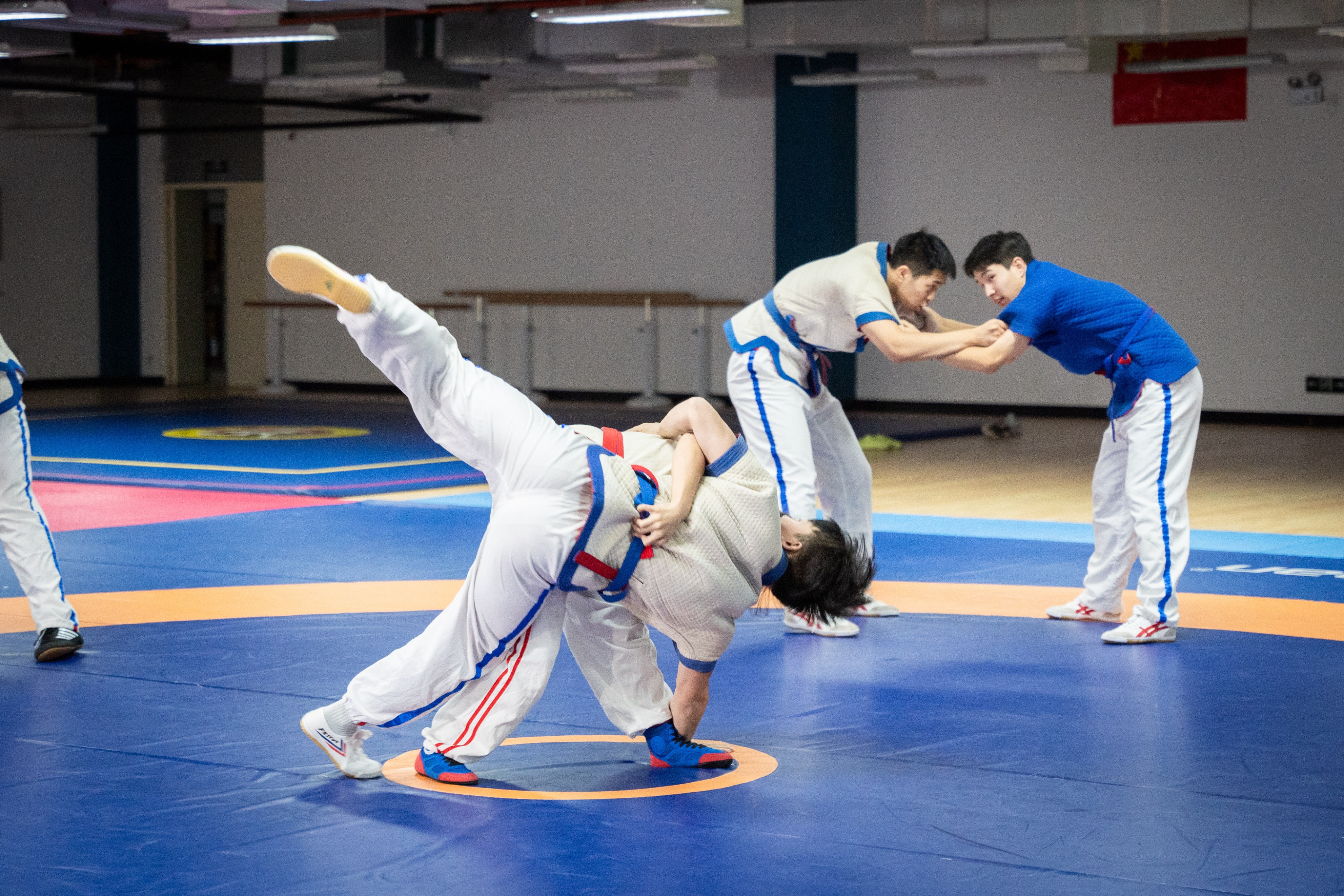 在日常训练中,队长谢宪锋会带大家热身训练,随后开始慢跑、静态拉伸、前后滚翻等专项训练,之后进入摔跤动作要领的熟练度练习和“摔假人”模拟练习,最后进行实战互摔。在老师的指导下,能够保证每位同学习得技巧与方法,在安全不受伤害的前提下完成规定摔跤动作。