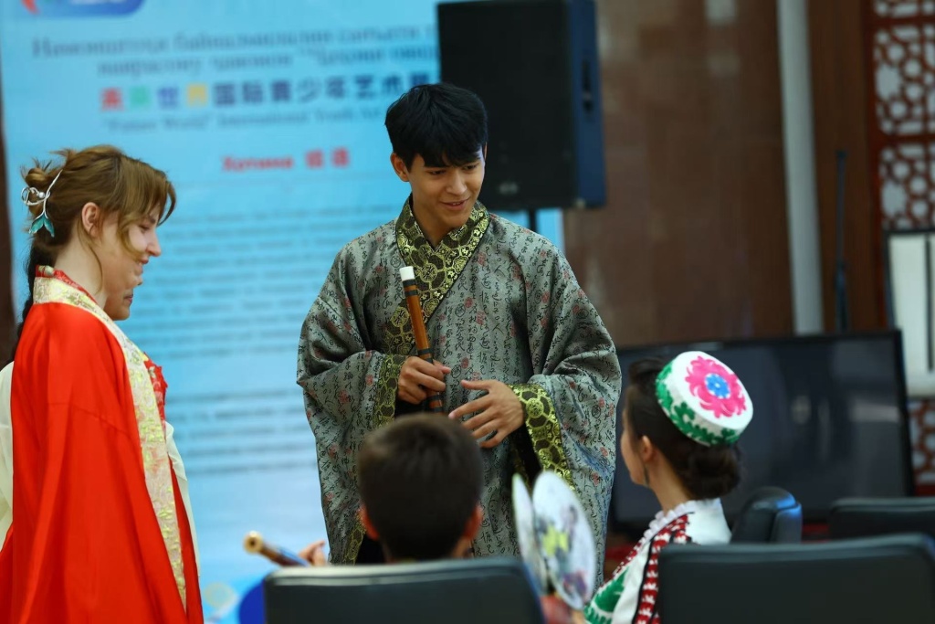 在文艺演出中,“未来世界”展演团员持续带来兼具艺术水准和创新表达的歌舞、武术节目,吸引各国来宾沉浸式欣赏。在巴黎联合国教科文总部,青少年们合奏的《喜奔那达慕》《红山魂》分别描绘了蒙古族少女策马奔向那达慕盛会的情景和中国北方新石器时代红山先民们的生活画卷,巧妙表达了中国的地大物博与历史的源远流长;在杜尚别塔吉克国家博物馆,青少年们表演的舞蹈节目《雨间竹林》《长安十二星辰》和武术节目《武动乾坤》,为现代歌舞注入中华元素,将活动推向高潮;在乌兹别克斯坦撒马尔罕大剧院,青少年们现场表演了起源于撒马尔罕、盛行于大唐、定格在敦煌壁画上的胡旋舞,以及融汇中国各民族歌曲的小合唱《一路欢歌》、民族器乐合奏《璀璨华章》等节目,以轻快活泼的韵律之美感染了在场观众。另有各国青少年献唱中文歌曲、演绎国风舞蹈,赢得在场观众的阵阵掌声。来自不同国家的同辈小友在台上交替演绎、台下互相切磋,结下宝贵友谊。