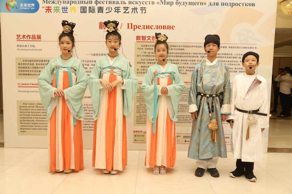 9月21日,“未来世界”国际青少年艺术节在乌兹别克斯坦撒马尔罕大剧院举行。图为丝路小使者为中乌两国嘉宾介绍丝路文化展项。