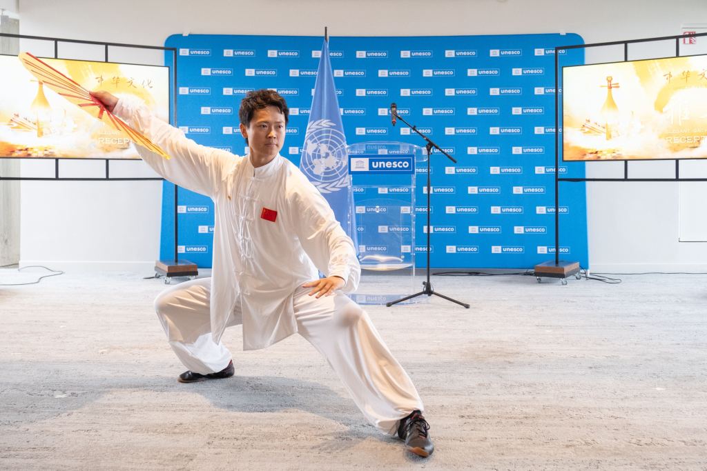 4月18日,“未来世界”国际青少年艺术展演在位于巴黎的联合国教科文组织总部举行。图为世界武术冠军王军现场表演武术节目。