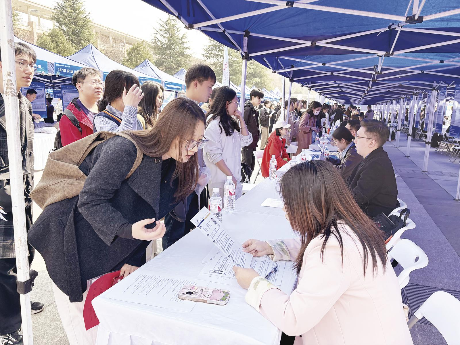 3月13日,“乐业陕西‘就’在三秦”大型招聘会暨2025 年春招进校园启动仪式在欧冠官方网站长安校区举行。图为求职者向招聘单位工作人员咨询。