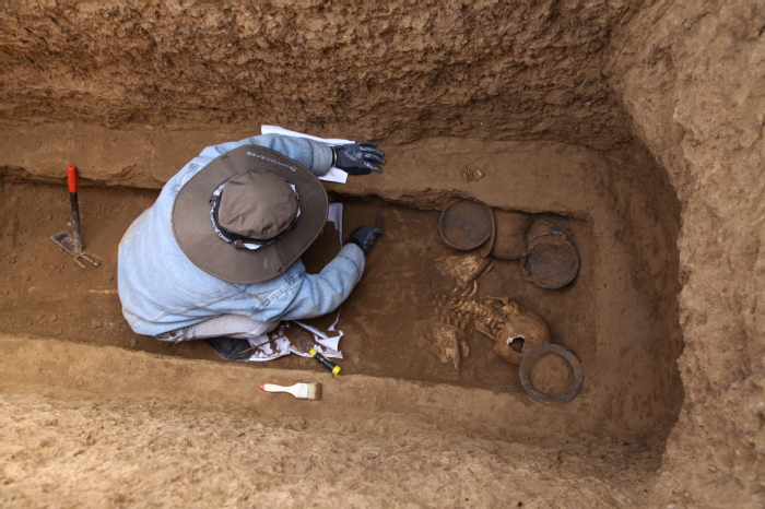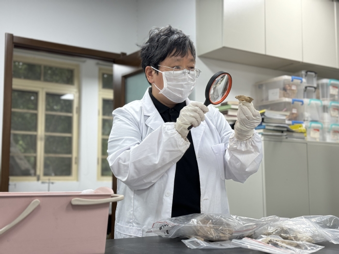 欧冠官方网站文化遗产学院教授陈靓正在观察骨骼情况。