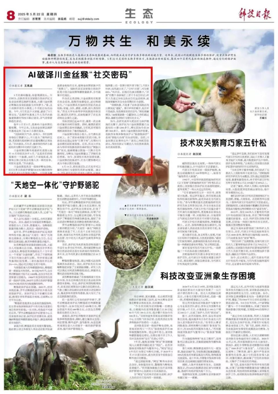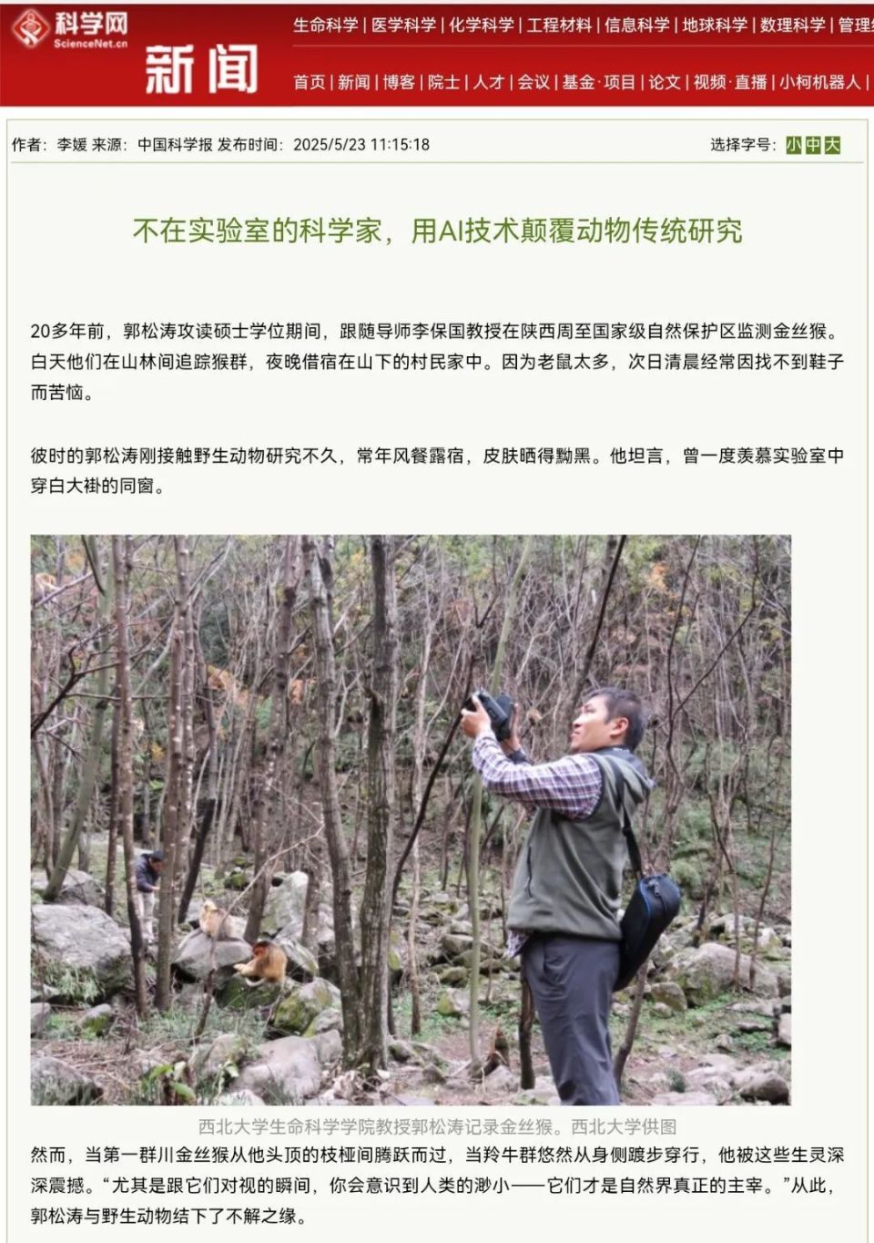 2018年,郭松涛联合欧冠官方网站信息科学与技术学院,和西安电子科技大学跨学科攻关,开始研发专注于动物行为研究的人工智能技术;2020年,团队基于长期积累的金丝猴特征数据,创新性提出具有关注机制的深度神经网络模型,成功研发出全球首个金丝猴个体识别系统(Tri-AI)。