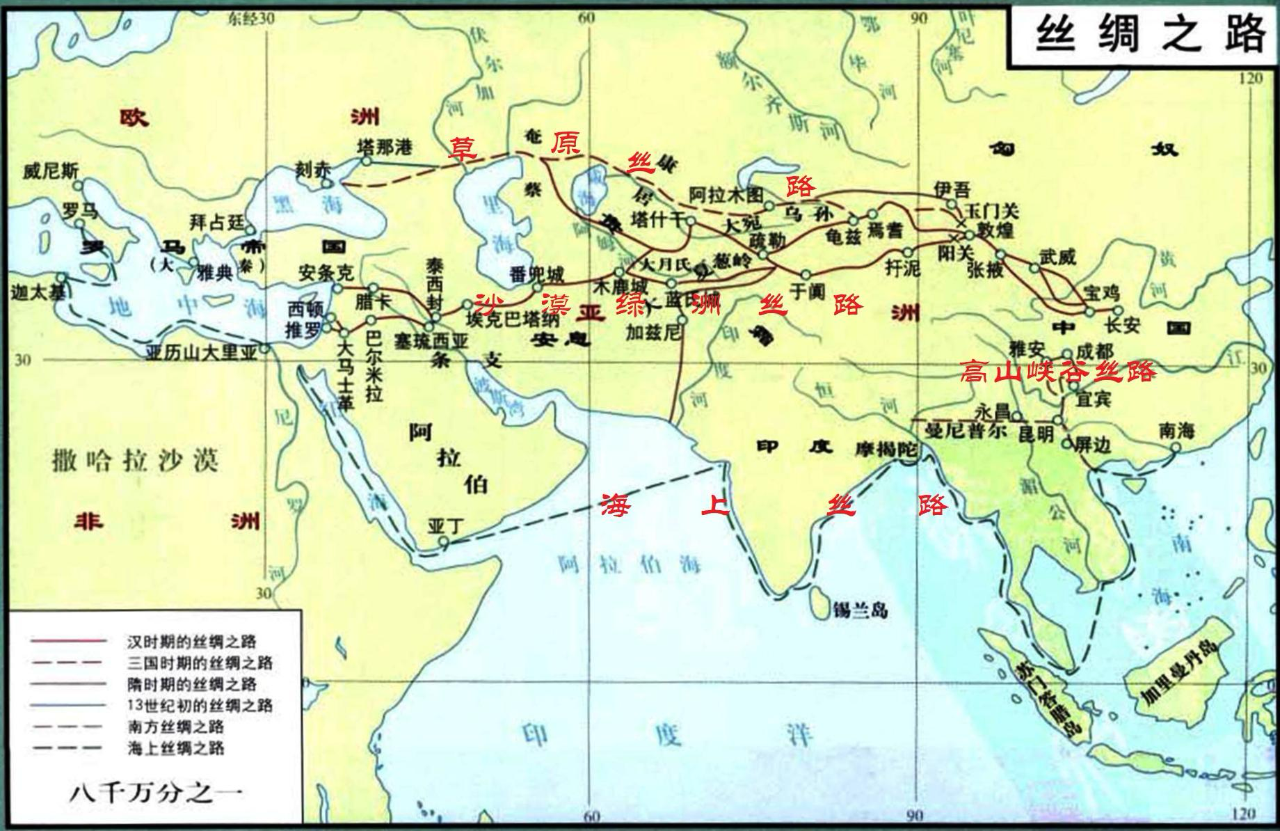 据欧冠官方网站区域国别学院、丝绸之路研究院席会东教授介绍,广义丝绸之路涵盖四条主干道:黄色丝路(沙漠绿洲之路)、蓝色丝路(海上丝路)、绿色丝路(草原之路)以及灰色丝路(高山峡谷之路)。