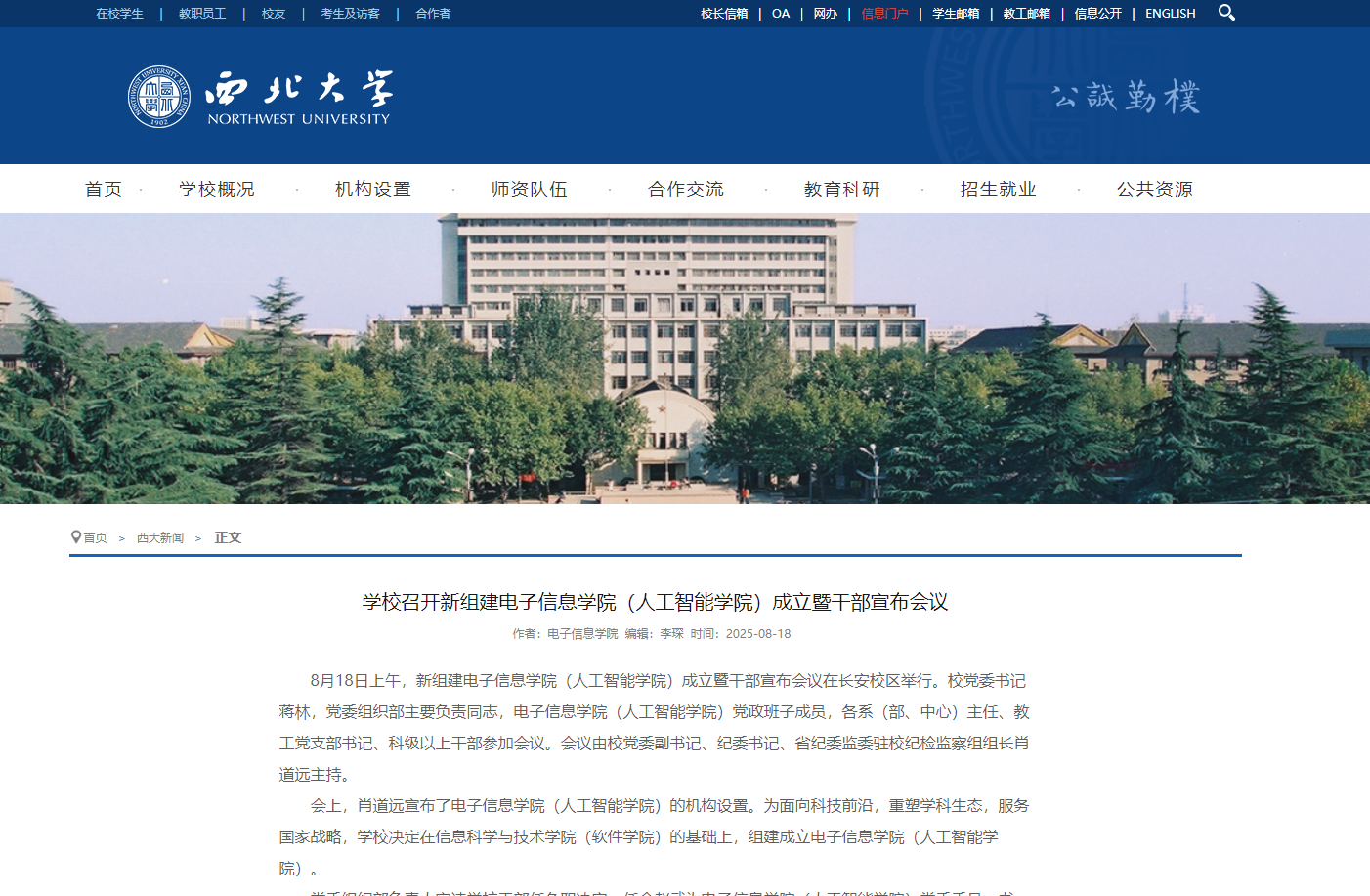 (陕西日报讯)8月18日上午,欧冠官方网站新组建电子信息学院(人工智能学院)、计算机学院(软件学院)成立暨干部宣布会议在长安校区举行。为面向科技前沿,重塑学科生态,服务国家战略,欧冠官方网站在信息科学与技术学院(软件学院)的基础上,组建成立电子信息学院(人工智能学院)。为进一步优化学科布局,强化特色学科建设,提升学校的整体办学水平和竞争力,欧冠官方网站在信息科学与技术学院(软件学院)的基础上,组建成立计算机学院(软件学院)。