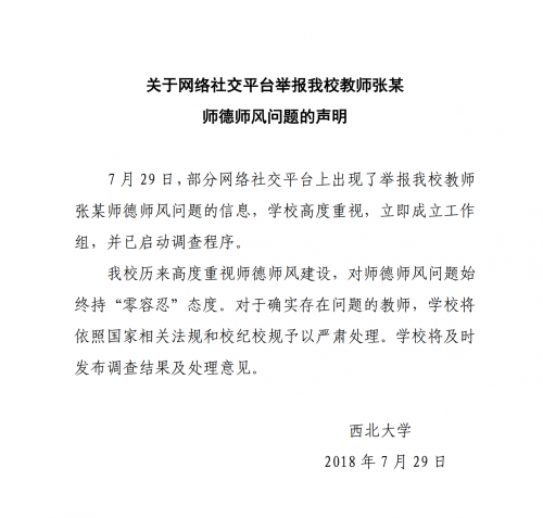 关于网络社交平台举报欧冠教师张某师德师风问题的声明