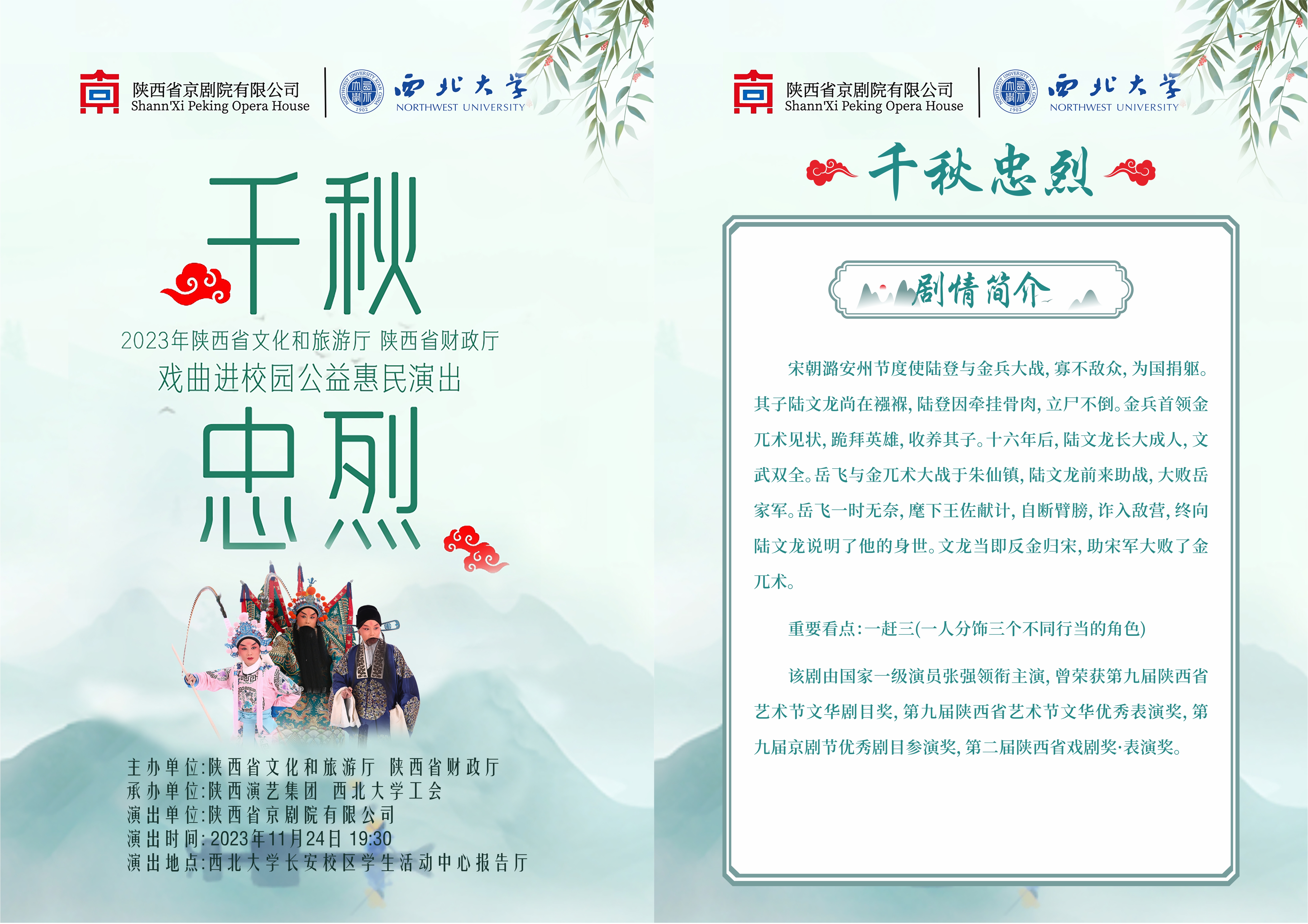 关于举办戏曲进校园公益惠民演出的通知 作者:校工会 编辑:罗娜 时间:2023-11-21 各基层分会: 为丰富校园文化生活,弘扬民族传统文化,传承京剧国粹艺术,校工会将于11月24日晚在长安校区学生活动中心报告厅举办戏曲进校园公益惠民演出活动。 请各分会于11月22日至校工会办公室(长安校区7号教学楼7217)领取演出门票。 演出剧目:京剧《千秋忠烈》 演出时间:2023年11月24日19:30 演出地点:欧冠官方网站长安校区学生活动中心 联 系 人:田霖 联系电话:88302521 校工会 2023年11月21日