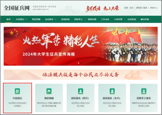 打开全国征兵网首页。男兵在应征报名之前要先完成兵役登记。点击“兵役登记(男兵)”进入操作页面。