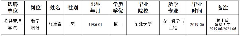 经用人单位及教学督导考核、学校研究,拟同意选聘下列人员来校工作,其聘任关系为A类人事代理。本着公平、公正、公开的原则,现将拟选聘人员基本情况公示如下:
