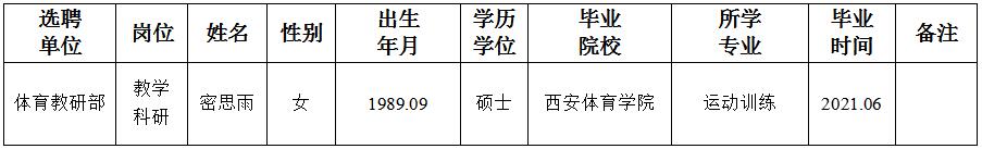 经用人单位及教学督导考核、学校研究,拟同意选聘下列人员来校工作,其聘任关系为A类人事代理。本着公平、公正、公开的原则,现将拟选聘人员基本情况公示如下: