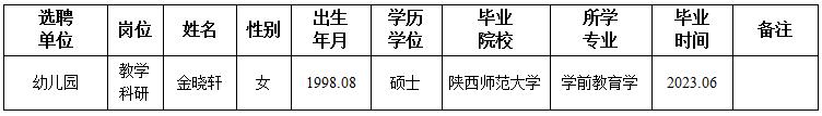 经用人单位及教学督导考核、学校研究,拟同意选聘下列人员来校工作,其聘任关系为人事代理。本着公平、公正、公开的原则,现将拟选聘人员基本情况公示如下: