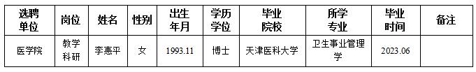 经用人单位及教学督导考核、学校研究,拟同意选聘下列人员来校工作,其聘任关系为人事代理。本着公平、公正、公开的原则,现将拟选聘人员基本情况公示如下: