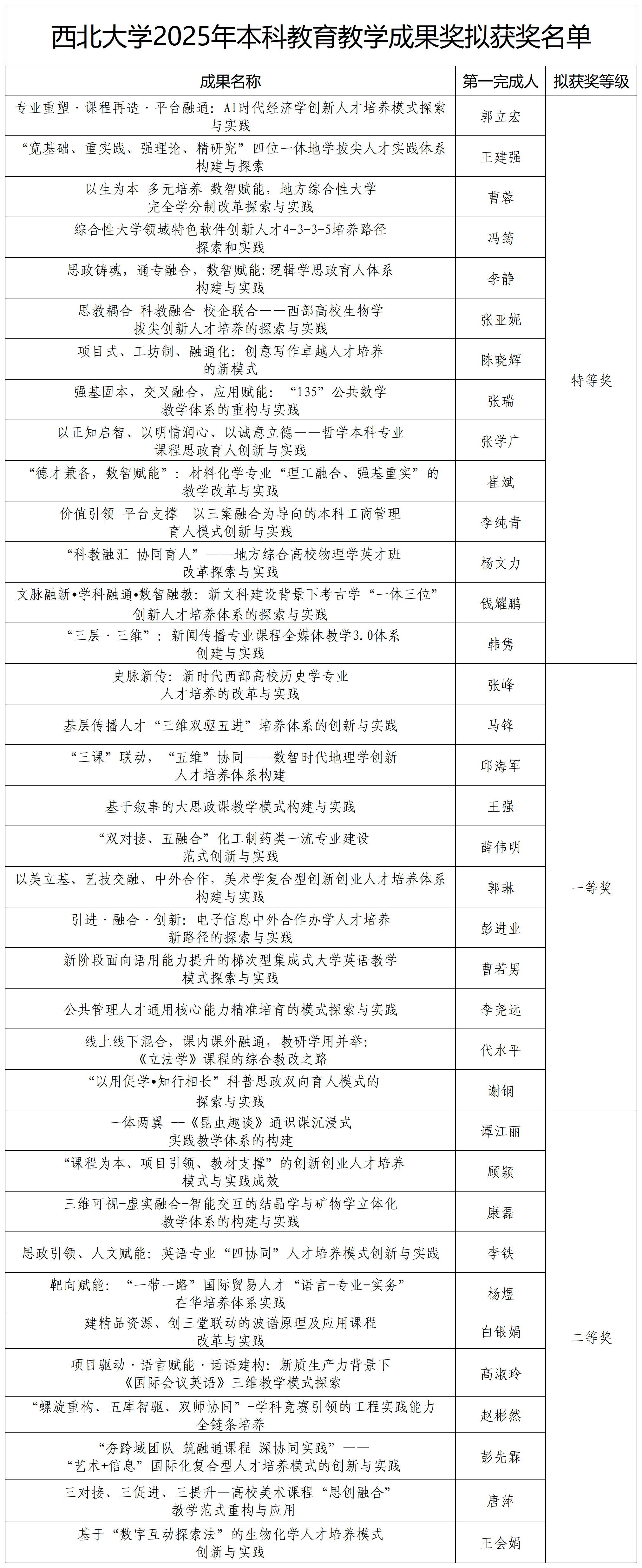 根据《欧冠官方网站关于开展2025年本科教育教学成果奖评选工作的通知》(西大教〔2025〕19号)要求,经个人申报、单位推荐与专家评审,拟确定“专业重塑·课程再造·平台融通:AI时代经济学创新人才培养模式探索与实践”等14项成果获特等奖,“史脉新传:新时代西部高校历史学专业人才培养的改革与实践”等11项成果获一等奖,“一体两翼-《昆虫趣谈》通识课沉浸式实践教学体系构建”等11项成果获二等奖。同时,将依序推荐参加陕西省2025年本科教育教学成果奖评选。现将拟获奖名单予以公示,公示期为2025年9月8日-12日。公示期任何单位或个人有异议,请实名以书面形式向教务处反映。