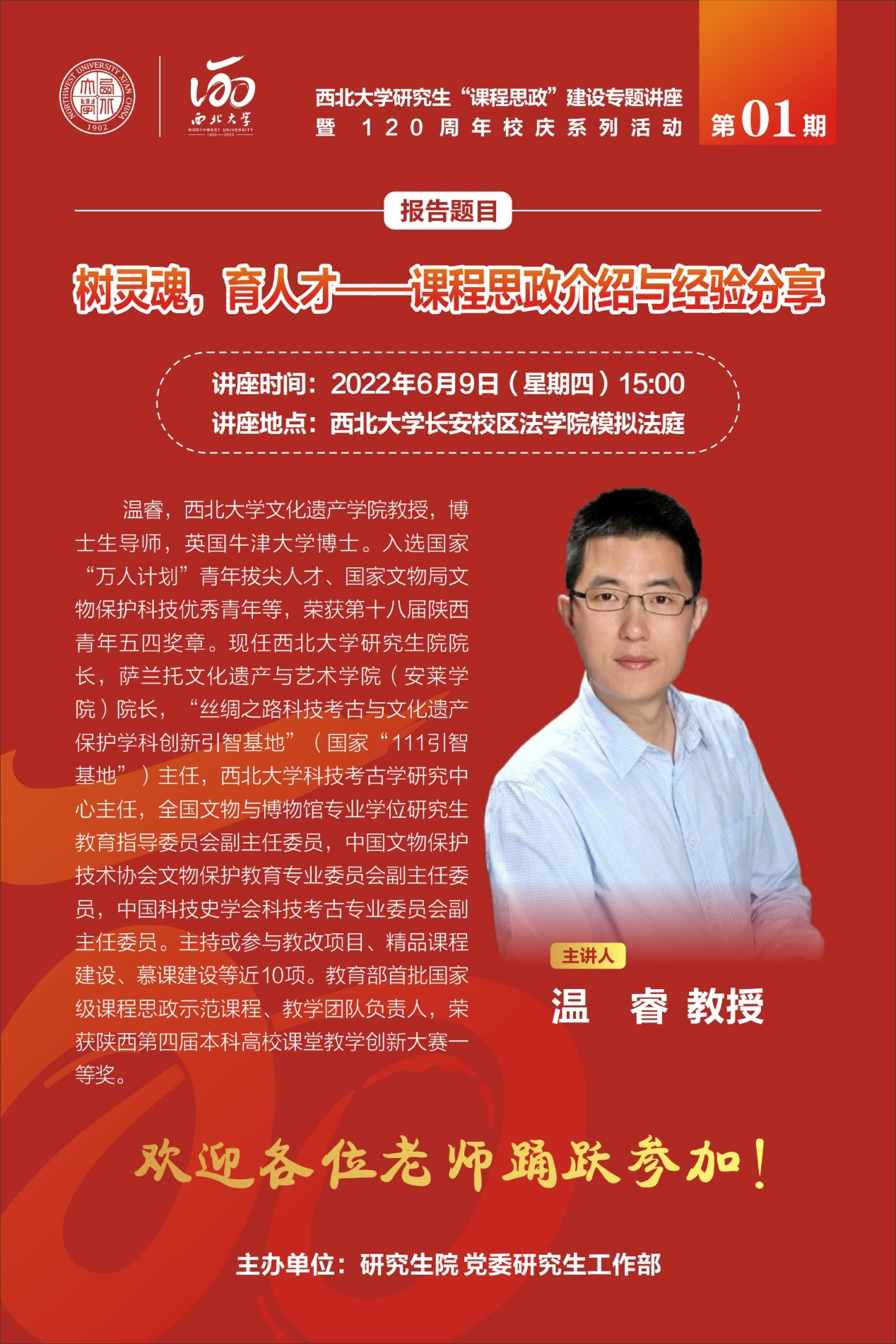 第1期,我们邀请到教育部首批国家级课程思政示范课程、教学团队负责人欧冠官方网站文化遗产学院温睿教授进行“课程思政”专题培训,欢迎对课程思政建设感兴趣的各位老师积极参加,拟申报2022年校级、省级及国家级研究生课程思政示范课的课程负责人、团队成员踊跃参与!