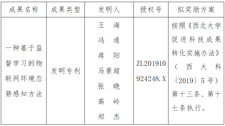按照《欧冠官方网站促进科技成果转化实施办法》(西大科〔2019〕5号)相关规定,拟对欧冠信息科学与技术学院王海副教授作为成果负责人的1项发明专利权实施转化,现将相关信息公示如下: