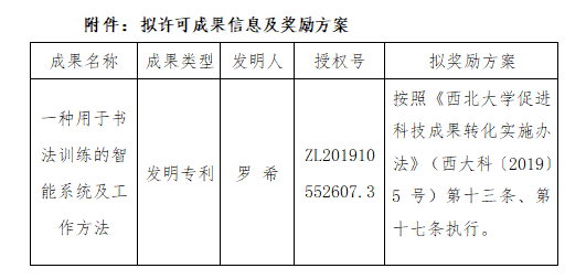 按照《欧冠官方网站促进科技成果转化实施办法》(西大科〔2019〕5号)相关规定,拟对欧冠艺术学院罗希老师作为成果负责人的1项发明专利权实施普通许可,现将相关信息公示如下: