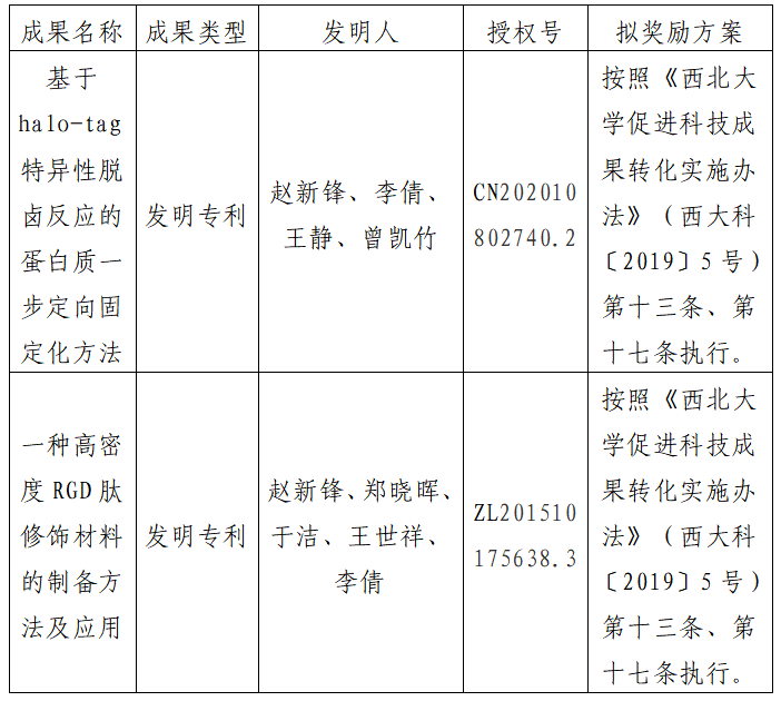 按照《欧冠官方网站促进科技成果转化实施办法》(西大科〔2019〕5号)相关规定,拟对欧冠生命科学学院赵新锋教授作为成果负责人的2项发明专利权实施普通许可,现将相关信息公示如下:
