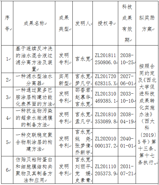 根据《欧冠官方网站促进科技成果转化实施办法》(西大科〔2019〕5号)相关规定,经学校科技成果转化工作小组、校长办公会审议,校党委常委会审定,拟对欧冠化材学院宫永宽教授作为成果负责人的6项专利(5项发明专利和1项实用新型专利)权实施独占许可,现将相关信息公示如下: