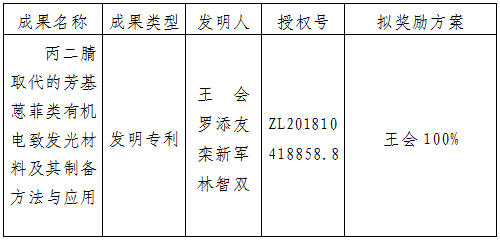 按照《欧冠官方网站促进科技成果转化实施办法》(西大科〔2019〕5号)相关规定,拟对欧冠化学与材料科学学院王会副教授作为成果负责人的1项发明专利权实施转化,现将相关信息公示如下:
