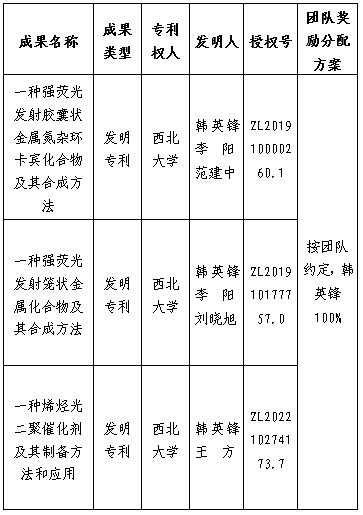 按照《欧冠官方网站促进科技成果转化实施办法》(西大科〔2019〕5号)相关规定,拟对欧冠化学与材料科学学院韩英锋教授作为成果负责人的3项发明专利权实施转化,现将相关信息公示如下:
