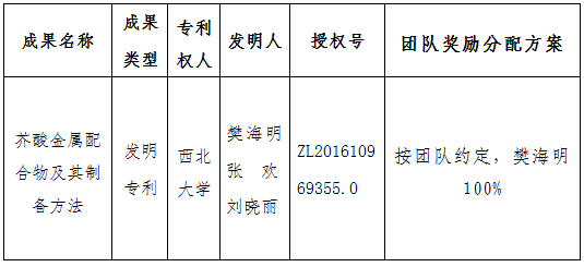 按照《欧冠官方网站促进科技成果转化实施办法》(西大科〔2019〕5号)相关规定,经科技成果转化工作小组审议,校长办公会审定通过,拟对欧冠化学与材料科学学院樊海明教授作为成果负责人的1项发明专利权实施以作价入股结合现金支付方式转让,现将相关信息公示如下: