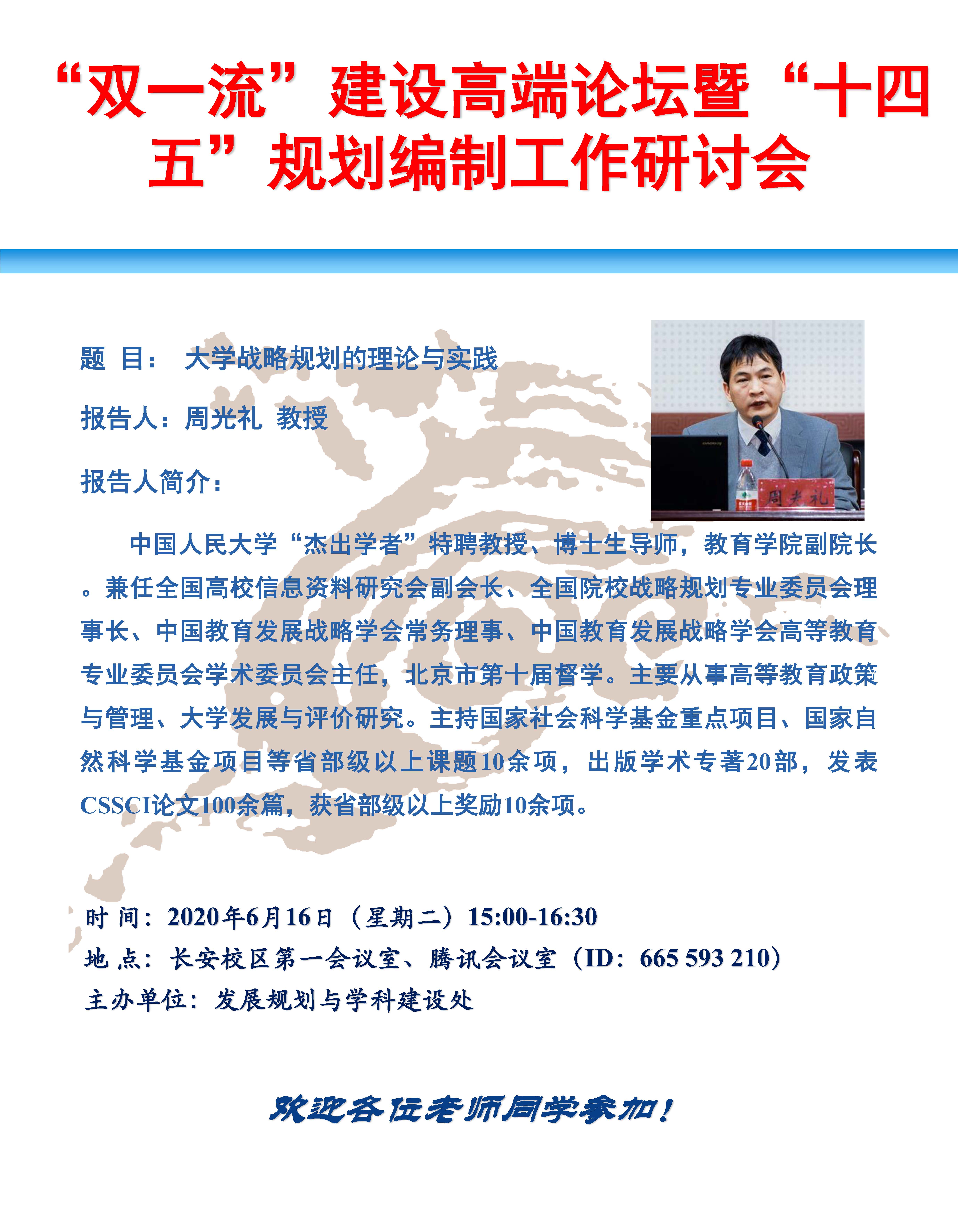 关于召开“双一流”建设高端论坛暨“十四五”规划编制工作研讨会的通知 作者:规划与学科处 编辑:王崇人 时间:2020-06-15 兹定于6月16日(星期二)下午15:00,在长安校区第一会议室、腾讯会议室(ID:665 593 210),举行“双一流”建设高端论坛暨“十四五”规划编制工作研讨会,邀请高等教育规划专家、中国人民大学“杰出学者”特聘教授周光礼教授作“大学战略规划的理论与实践”的专题报告。 请“十四五”规划编制领导小组成员单位主要负责人,各院系主要负责人参会。 欢迎广大师生在线收看! 发展规划与学科建设处 2020年6月15日