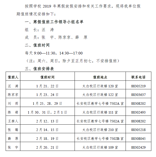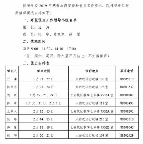 发展规划与学科建设处2019年寒假值班安排