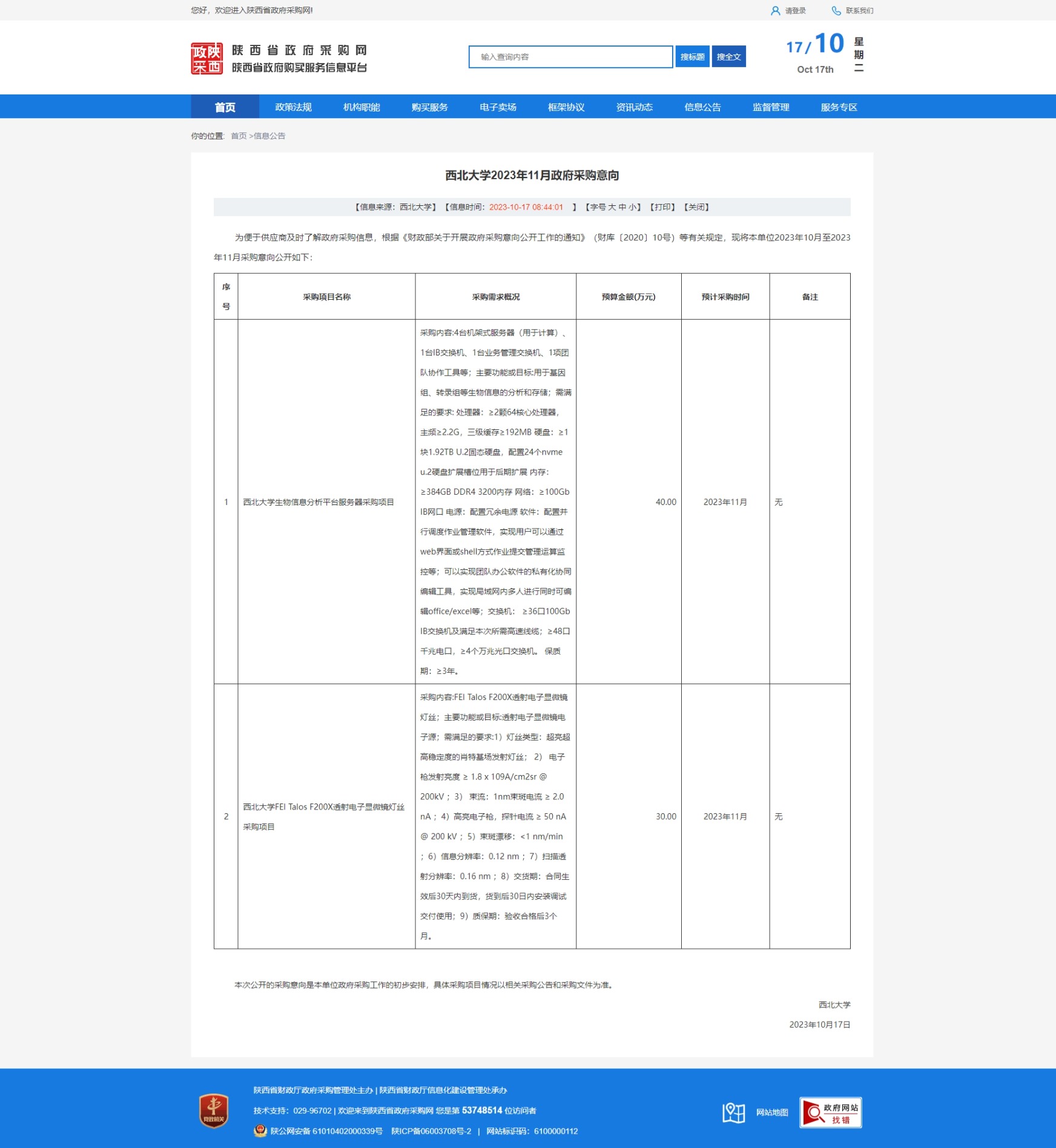 欧冠官方网站2023年11月政府采购意向 作者: 编辑:采购与招标办公室 时间:2023-10-17 原公告链接:http://www.ccgp-shaanxi.gov.cn/freecms/site/shaanxi/ggxx/info/2023/8a69c1288b1ca82f018b1da2697d31f0.html?noticeType=59¬iceId=8cf5519b-6c87-11ee-9a8e-08c0eb20c666