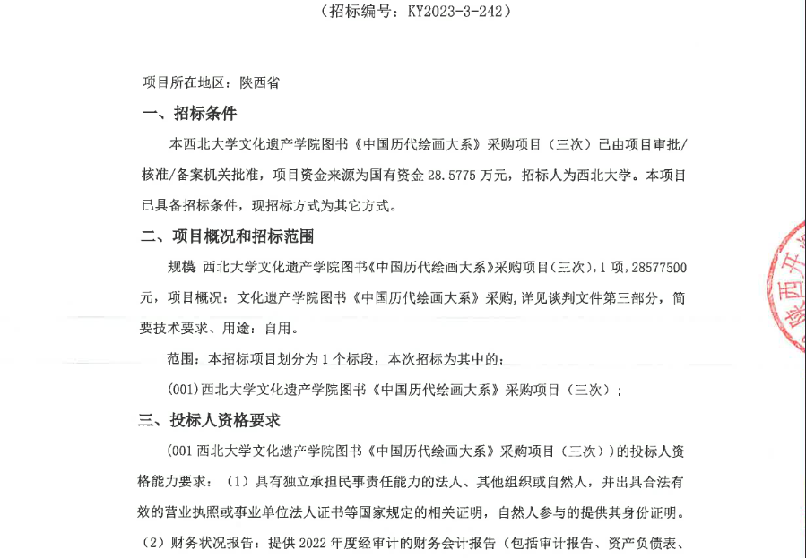 欧冠官方网站文化遗产学院图书《中国历代绘画大系》采购项目(三次)竞争性谈判公告 作者: 编辑:采购与招标办公室 时间:2023-10-17 原公告链接:http://bulletin.sntba.com/biddingBulletin/2023-10-17/734748.html