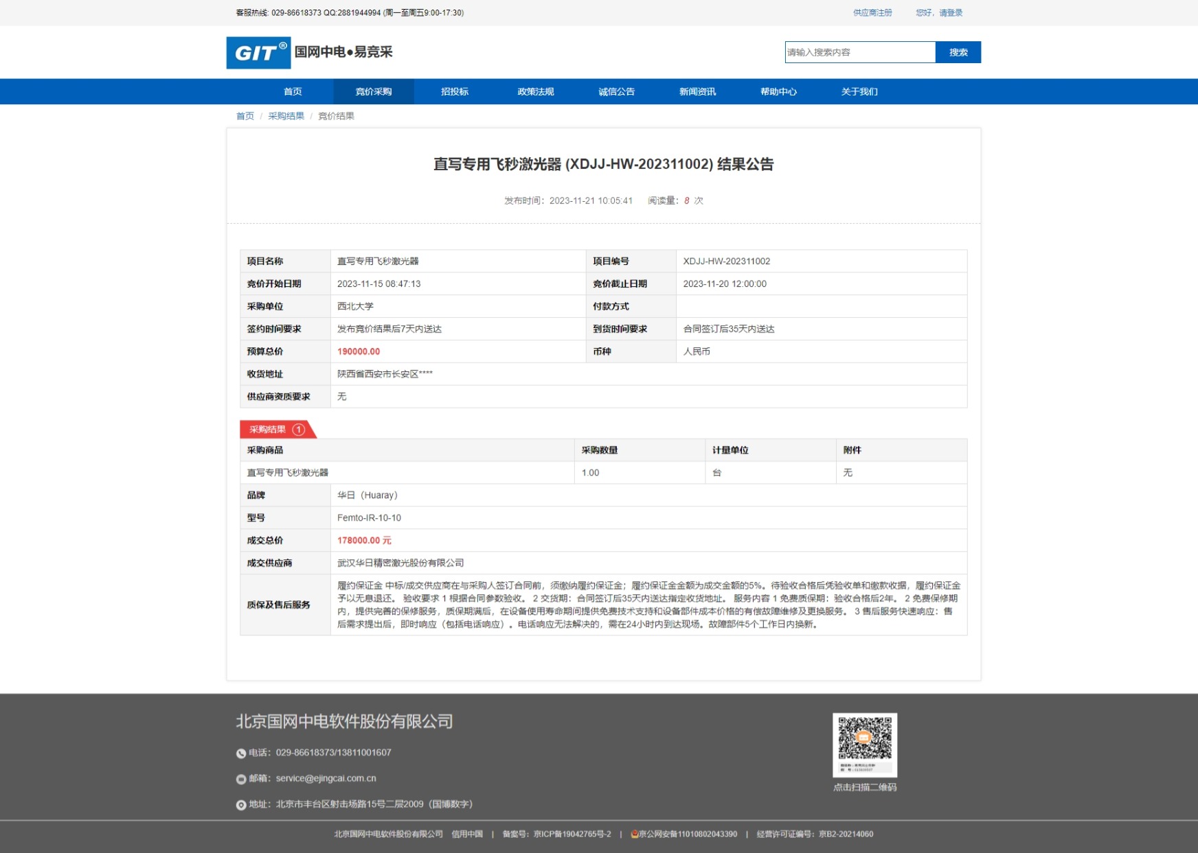 欧冠官方网站直写专用飞秒激光器采购项目结果公告 作者: 编辑:采购与招标办公室 时间:2023-11-22 原公告链接:https://www.ejingcai.com.cn/site/bidding/detail/6959