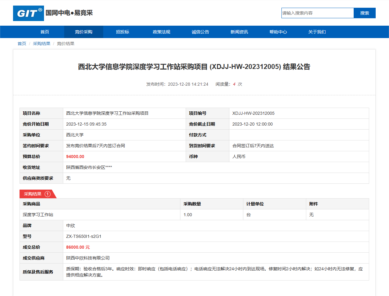 欧冠官方网站信息学院深度学习工作站采购项目 (XDJJ-HW-202312005) 竞价结果公告 作者: 编辑:采购与招标办公室 时间:2023-12-28 原公告链接:https://www.ejingcai.com.cn/site/bidding/detail/8075
