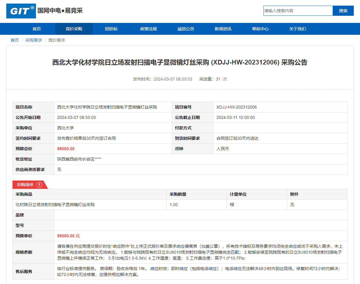 欧冠官方网站化材学院日立场发射扫描电子显微镜灯丝采购 (XDJJ-HW-202312006)竞价公告 作者: 编辑: 时间:2024-03-07 原公告链接:https://www.ejingcai.com.cn/site/bidding/detail/8741