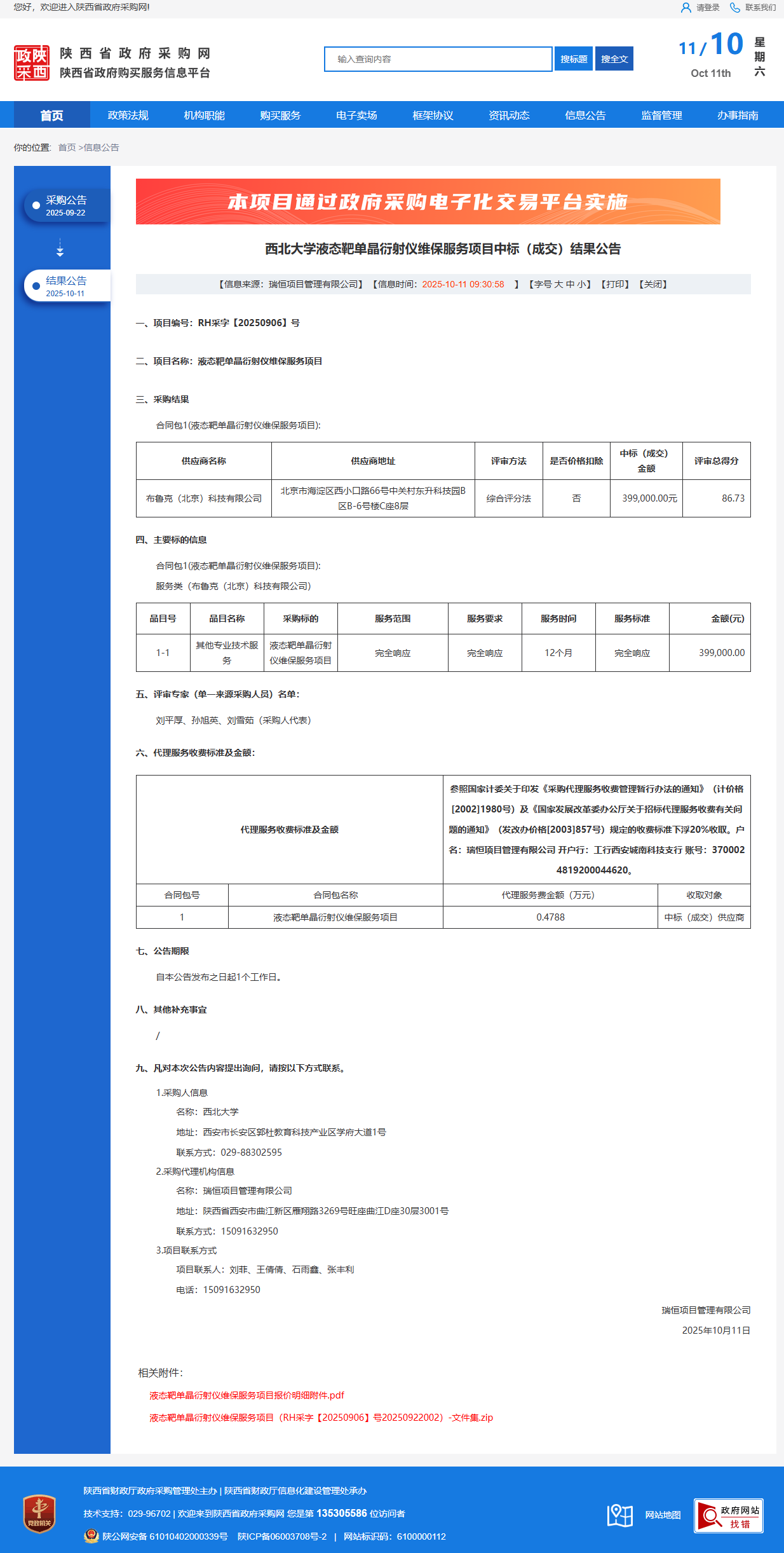 欧冠官方网站液态靶单晶衍射仪维保服务项目中标(成交)结果公告