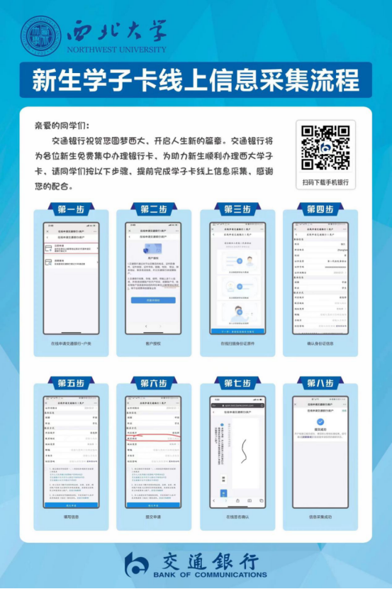 为做好2022级新生入学准备工作,确保学生济困助学、奖助学金、生活补助、勤工俭学等及时、准确发放,交通银行太白路支行近期将集中开展2022级新生学子卡办理工作,学子卡分为线上信息采集和线下激活两个步骤。具体工作安排如下: