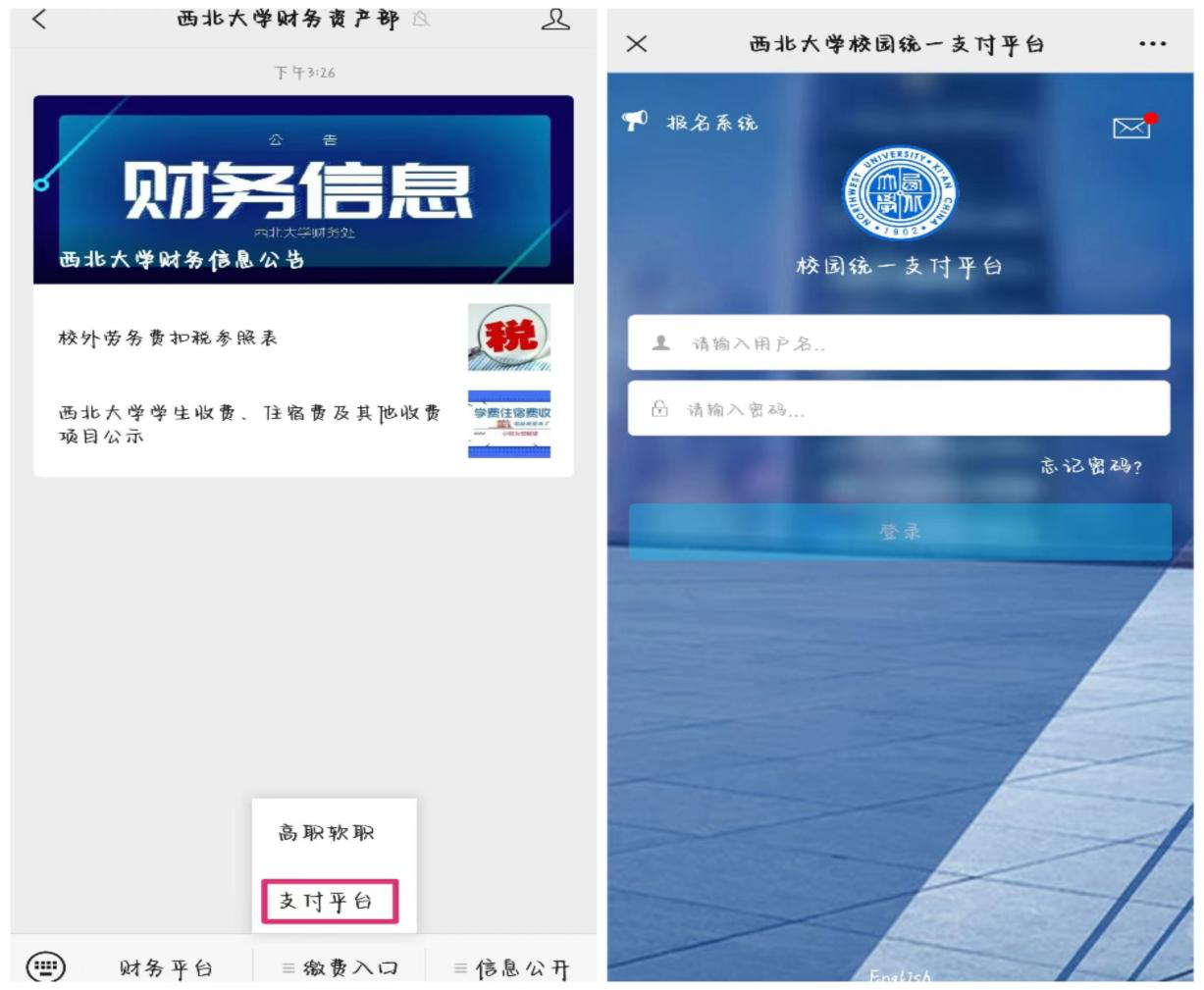 手机端:关注“欧冠官方网站财务资产部”微信公众号,选择“缴费入口”点击“支付平台”进入。(见下图)