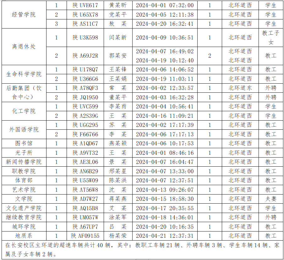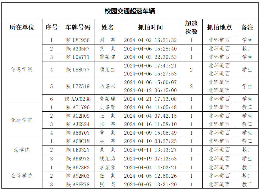 为加强校内道路交通安全管理,规范校内交通秩序,根据《欧冠官方网站校园道路交通管理办法》有关要求,现将2024年4月校园交通违章车辆予以曝光,4月份教工超速车辆占52%、学生超速车辆占35%、外聘职工及教工家属车辆占12%,请所在单位加强对本单位违章师生员工的教育和管理,对于校内曝光超速的学生车辆将取消下一年度的通行证办理资格。
