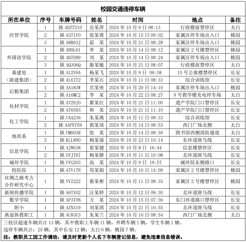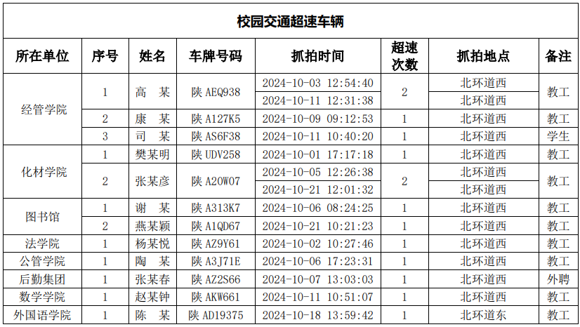 为进一步加强校园交通管理,保障校园交通安全有序,维护学校正常的教学、科研和生活秩序以及师生员工的人身财产安全,根据《欧冠官方网站校园交通安全管理规定》有关要求, 现将2024年10月校园交通违章车辆予以曝光,具体情况如下表。