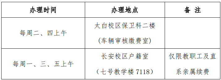 四、车辆通行期限到期前60日,进出校门时闸机会语音提醒并显示剩余通行天数。通行期限到期的车辆,管理系统将视为临时车辆且自动计费。因公出国(境)、出差等原因未能或不能及时续费的车辆,请持相关证明材料到太白校区保卫科办理手续。