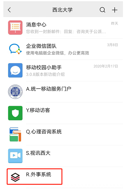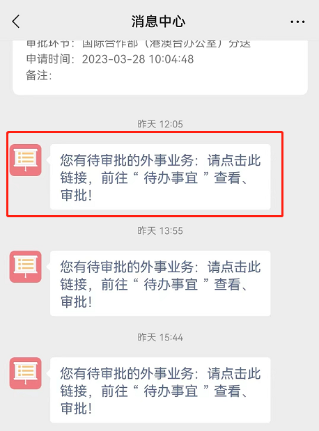 通过手机微信“欧冠官方网站”-“消息中心”-“R.外事系统”路径,可以进行业务查看及审批。